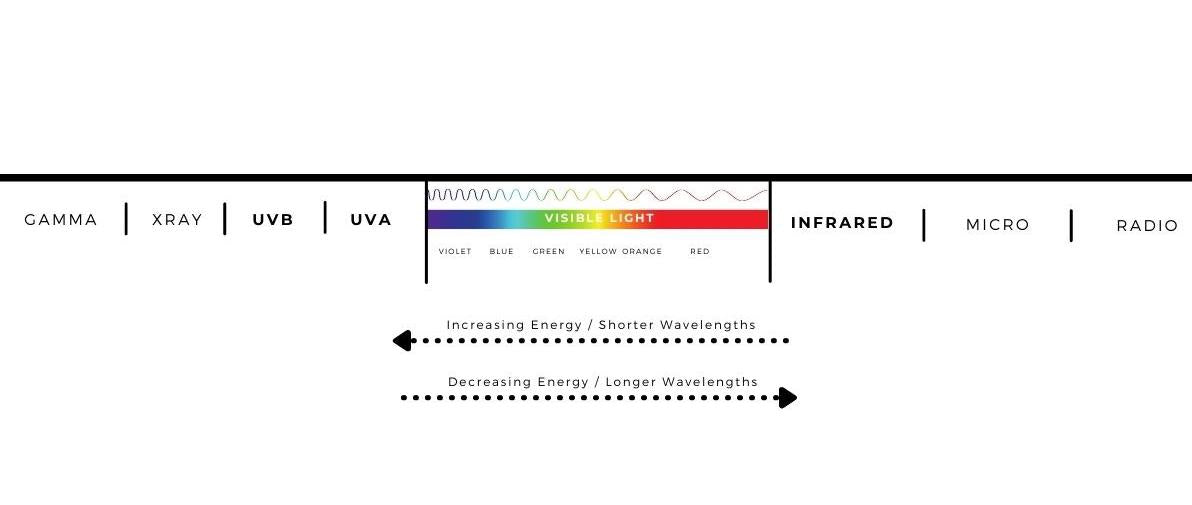 Each of these colors of visible light has a wavelength and energy. For example, red light has the longest, slowest moving wavelength, while blue light has shorter, faster wavelengths.